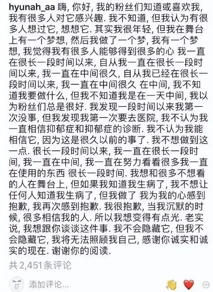 早在2019年,金泫雅就在社交平台发长文坦言自己患有恐慌障碍和忧郁症。“2016年去医院后才知道,这样一直坚强的我,无法相信自己患上了忧郁症和恐慌障碍”,而选择公开患病事实,是“想要心情能稍微轻松一些”,并因状态不好对支持自己的人感到抱歉。