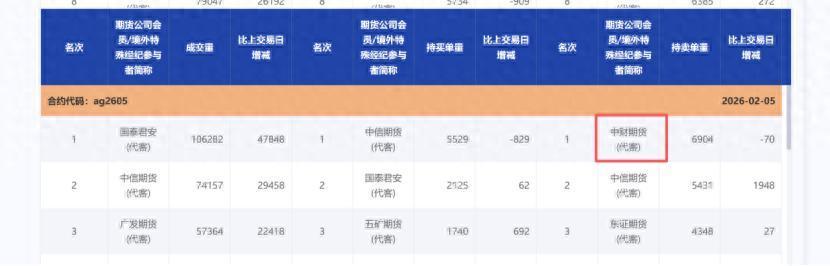 根据沪银期货此前的数据来看,在1月20日,中财期货(代客)仅出现AG2606合约的持仓排名表中,彼时持有空单1757手。